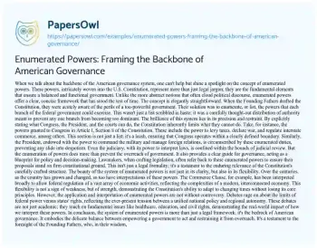 This essay delves into the concept of enumerated powers, a cornerstone of the American governance system as outlined in the U.S. Constitution. It discusses how the Founding Fathers meticulously listed the specific powers of each federal branch to maintain balance and prevent government overreach. The essay highlights the dual nature of enumerated powers, serving both as a restraining leash and a guiding framework for governance. It touches on the adaptability of these powers, emphasizing their relevance in addressing contemporary issues while respecting the core principles established centuries ago. Additionally, the essay acknowledges ongoing debates surrounding the interpretation of these powers, illustrating their significant impact on federal and state dynamics and key societal issues. This reflective piece underscores the enduring significance and complexity of enumerated powers in shaping American democracy. Additionally, PapersOwl presents more free essays samples linked to Government.