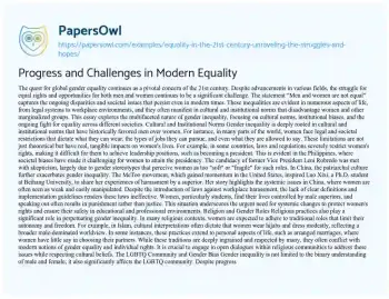 Progress and Challenges in Modern Equality. (2023, Aug 24). Retrieved from https://hub.papersowl.com/examples/equality-in-the-21st-century-unraveling-the-struggles-and-hopes/