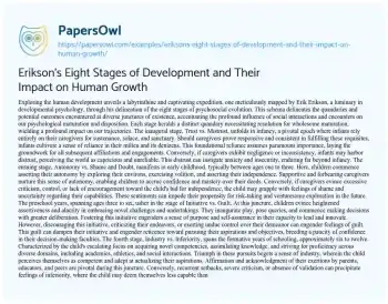 This essay is about Erik Erikson’s eight stages of psychosocial development, outlining how each stage influences human growth and personality. It explains the conflicts at each stage, from Trust vs. Mistrust in infancy to Integrity vs. Despair in late adulthood, and highlights the importance of resolving these conflicts for healthy development. The essay emphasizes how social interactions and personal experiences shape psychological growth, underscoring the cumulative nature of development. It also discusses the potential for growth and change at every age, encouraging a holistic view of development that recognizes the significance of each life phase.