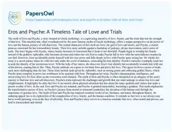 This essay delves into the captivating Greek myth of Eros and Psyche, a timeless tale of love, beauty, and the trials that define it. It explores the central characters, their forbidden love, and the jealousy that sets their story in motion. As the narrative unfolds, we witness Psyche’s journey of self-discovery and her quest to prove her love for Eros through a series of challenging trials. The essay delves into the allegorical interpretations of the myth, emphasizing its significance as a reflection of the soul’s quest for true love and enlightenment. This enchanting myth, often overshadowed by other Greek legends, serves as a profound exploration of love’s transformative power and its enduring influence on art, literature, and human understanding. It’s a reminder that love, when tested and proven, can lead to transcendent happiness and eternal significance. On PapersOwl, there’s also a selection of free essay templates associated with Love.
