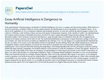 This essay about the dangers inherent in the advancement of Artificial Intelligence (AI). It highlights the potential threats posed by AI, including the development of autonomous weaponry, algorithmic bias, and the looming prospect of superintelligent AI. The essay emphasizes the need for caution and ethical considerations in the deployment of AI technologies to mitigate these risks and safeguard humanity’s future.