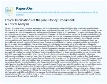 This essay about the ethical implications of the John Money experiment critically examines the tragic case of David Reimer, who was raised as a girl following a failed circumcision and subsequent medical advice. It discusses issues of informed consent, the harm caused by unethical medical practices, and the misuse of authority in clinical research. The text highlights the severe psychological impact on Reimer and critiques the ethical lapses in handling his case, emphasizing the need for compassion and strict ethical standards in medical practices and research.