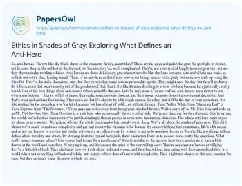 This lively and engaging essay dives into the captivating world of anti-heroes, those unconventional main characters who defy the traditional hero mold. It paints a vivid picture of anti-heroes as the flawed, relatable protagonists who straddle the line between hero and villain. The essay uses a playful and conversational tone to explain how anti-heroes, unlike typical heroes, are driven by complex, often self-serving motives. Characters like Walter White and Tony Soprano are highlighted as quintessential examples, showcasing the appeal of these morally ambiguous figures. The piece delves into how the rise of anti-heroes in media reflects a societal shift towards embracing complexity and realism in storytelling. It also discusses the role of anti-heroes in challenging and redefining our notions of morality and heroism. Overall, the essay celebrates anti-heroes as a vital and intriguing aspect of modern narratives, bringing depth, realism, and a touch of unpredictability to the stories we love. PapersOwl offers a variety of free essay examples on the topic of Ethics.