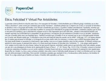 La presente síntesis aborda la relación entre ética y los conceptos de felicidad y virtud abordados por el filósofo griego Aristóteles en su obra “Ética a Nicómaco”, texto escrito por Aristóteles para su hijo Nicómaco.