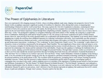 This essay dives into the world of literary epiphanies, those ‘aha’ moments that define characters and pivot narratives. Using a conversational and engaging tone, it explores several classic and modern examples from literature where characters experience groundbreaking realizations. Starting with James Joyce’s “Araby,” it depicts the protagonist’s poignant transition from romantic idealism to the reality of life. The essay then swims through Kate Chopin’s “The Awakening,” where Edna Pontellier’s self-discovery is brilliantly symbolized through her learning to swim. It doesn’t stop there; a dramatic turn to Tolstoy’s “War and Peace” showcases Prince Andrei’s existential epiphany amidst the chaos of battle. The essay also touches upon Khaled Hosseini’s “The Kite Runner,” where a journey back home becomes a path to redemption. Throughout, the essay highlights how these epiphanies not only drive the story forward but also offer deep insights into the characters’ inner worlds, making them relatable and memorable. The discussion brings to light the power of these moments in literature, reflecting our own personal journeys of discovery and transformation. You can also find more related free essay samples at PapersOwl about Literature.