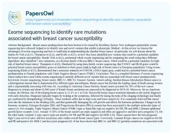 An in-depth analysis of how exome sequencing, which targets protein-coding regions of genomes, can be employed to uncover rare mutations that heighten the risk of breast cancer. The essay would also discuss the implications of these findings for personalized medicine and genetic counseling. More free essay examples are accessible at PapersOwl about Biotechnology topic.