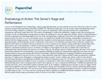 Applying Dramaturgy to my life involves recognizing the interplay between my roles, the impressions I project, and my performances. As both a student and an employee, I am expected to fulfill specific responsibilities with dedication and enthusiasm. Effective impression management requires aligning my facework with the persona I wish to project, whether as a diligent student or a competent server. Role embracement enhances my connection with customers and enriches my learning experience, motivating me to excel in both arenas.
