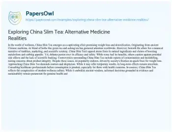 Dive into the world of wellness with ‘Exploring China Slim Tea: Alternative Medicine Realities.’ This essay delves into the captivating narrative surrounding the popular beverage, examining its promises of weight loss and detoxification. Rooted in traditional Chinese medicine, the tea blends herbs like green and oolong tea, sparking debates about its efficacy and safety. The essay unravels the complex interplay between ancient traditions, contemporary marketing, and scientific scrutiny. From its potential benefits to concerns about product integrity, it navigates the nuanced landscape of China Slim Tea, urging readers to approach wellness with a critical eye and a focus on evidence-based practices. Ultimately, it explores the broader themes of modern wellness culture and the quest for health in a world filled with quick fixes and ancient remedies. PapersOwl showcases more free essays that are examples of Alternative Medicine.