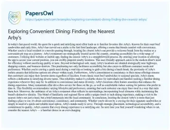 This essay about finding the nearest Arby’s explores the convenience and accessibility of this popular fast-food chain. It emphasizes how Arby’s strategically positions its locations near highways, shopping centers, and business districts, making it easy for customers to enjoy their favorite meals wherever they are. The essay highlights the user-friendly methods for locating nearby Arby’s restaurants, such as through their website and mobile app. It also underscores Arby’s commitment to consistency in menu offerings and its accommodation of various dining preferences, whether through drive-thru service or comfortable indoor seating. Ultimately, the essay portrays Arby’s as a reliable choice for a quick and satisfying dining experience.
