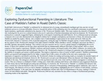 Exploring Dysfunctional Parenting in Literature: The Case of Matilda's Father in Roald Dahl's Classic. (2023, Nov 17). Retrieved from https://hub.papersowl.com/examples/exploring-dysfunctional-parenting-in-literature-the-case-of-matildas-father-in-roald-dahls-classic/