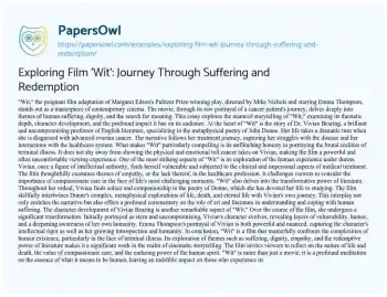 This essay offers an in-depth analysis of the film “Wit,” an adaptation of Margaret Edson’s Pulitzer Prize-winning play, directed by Mike Nichols and starring Emma Thompson. The film is explored as a poignant narrative that delves into the human experience of suffering, dignity, and redemption through the journey of Dr. Vivian Bearing, an English professor diagnosed with ovarian cancer. The essay discusses the film’s unflinching portrayal of the harsh realities of terminal illness and the impact of the clinical environment on the patient’s experience. It highlights the exploration of themes such as empathy in healthcare, the transformative power of literature, and the deep introspection and humanity of Vivian’s character. The interplay of John Donne’s poetry with Vivian’s ordeal is noted for enriching the narrative and offering insight into coping with suffering. The essay concludes by recognizing “Wit” as a profound cinematic work that invites reflection on life, death, and the human spirit, emphasizing its lasting impact on audiences and its significance in cinematic storytelling. At PapersOwl, you’ll also come across free essay samples that pertain to Film