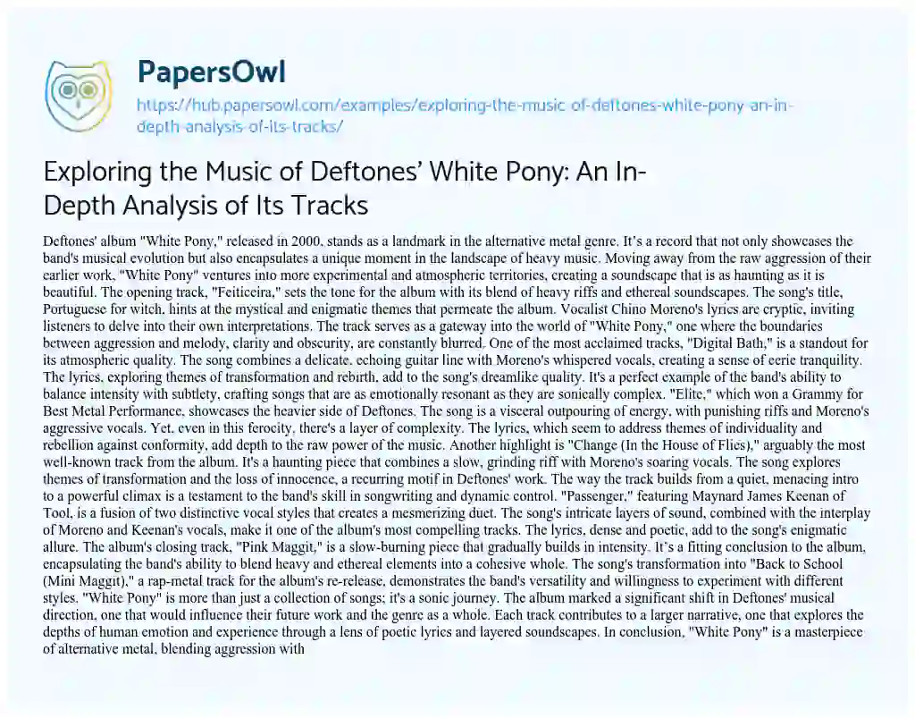 This essay delves into the intricate musical landscape of Deftones’ acclaimed album “White Pony,” exploring the depth and diversity of its tracks. Released in 2000, the album marks a significant evolution in the band’s style, blending alternative metal with experimental and atmospheric elements. The essay examines key tracks like “Feiticeira,” “Digital Bath,” and the Grammy-winning “Elite,” highlighting their unique blend of heavy riffs, ethereal soundscapes, and cryptic lyrics. Special attention is given to “Change (In the House of Flies)” for its haunting melody and thematic exploration of transformation and loss of innocence. The collaboration with Maynard James Keenan in “Passenger” is also explored, showcasing the album’s versatility and the band’s willingness to experiment with different styles. Concluding with “Pink Maggit,” the essay encapsulates “White Pony” as a journey through a range of human emotions and experiences, expressed through a fusion of aggressive and subtle musical elements. This analysis positions “White Pony” as not just a pivotal album in Deftones’ discography, but as a landmark in the alternative metal genre. At PapersOwl too, you can discover numerous free essay illustrations related to Music