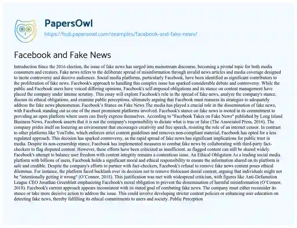 Facebook and Fake News. (2019, May 13). Retrieved from https://hub.papersowl.com/examples/facebook-and-fake-news/