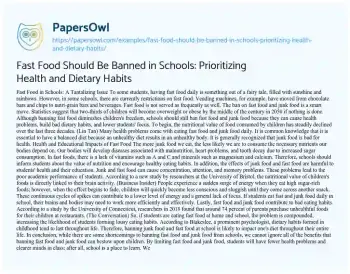 This essay will argue for the banning of fast food in schools, emphasizing the importance of promoting healthy eating habits among students. It will explore the negative health implications of fast food, including its contribution to obesity, diabetes, and heart diseases. The piece will discuss the role of schools in shaping children’s dietary choices and how the availability of fast food undermines efforts to encourage nutritious eating. It will also examine potential challenges to implementing such a ban and suggest alternatives for school cafeterias. The overview aims to highlight the necessity of prioritizing health in educational settings and the long-term benefits of instilling healthy eating habits from a young age. You can also find more related free essay samples at PapersOwl about Healthy Diet.
