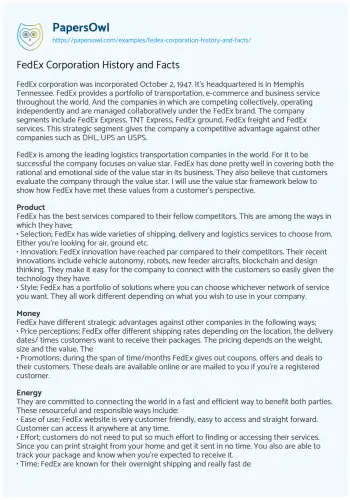 FedEx Corporation History and Facts. (2019, Aug 18). Retrieved from https://hub.papersowl.com/examples/fedex-corporation-history-and-facts/