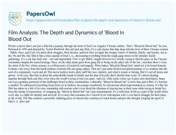 This essay provides an insightful film analysis of “Blood In Blood Out,” a cult classic that delves into the heart of Chicano culture in East Los Angeles. Directed by Taylor Hackford, the film follows the interconnected lives of three cousins, Miklo, Paco, and Cruz, each navigating their own paths amid the backdrop of the 1970s and 1980s. The essay explores the film’s portrayal of gang life, family dynamics, and the struggle for identity, highlighting its authentic depiction of the Chicano experience. It discusses the character arcs and their significance in representing various responses to societal challenges, including issues of race, loyalty, and belonging. The film’s unflinching approach to depicting the harsh realities of gang and prison life is examined, acknowledging its role in both reinforcing and challenging stereotypes. Furthermore, the essay touches on the film’s cultural impact and its role as a cultural artifact, resonating deeply with audiences through its gritty storytelling and exploration of profound themes. “Blood In Blood Out” is presented as more than just a film; it’s a powerful narrative that continues to engage and provoke thought about identity, community, and survival in the face of adversity. On PapersOwl, there’s also a selection of free essay templates associated with Film Analysis.
