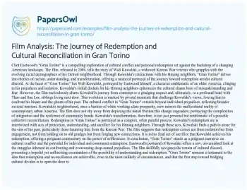 This essay about “Gran Torino” delves into the film’s exploration of cultural conflict and personal redemption. It highlights Clint Eastwood’s portrayal of Walt Kowalski, a Korean War veteran whose prejudice against his Hmong neighbors evolves into a protective bond, particularly with the characters Thao and Sue. The film is analyzed for its depiction of the transformative power of personal connections across cultural divides and the protagonist’s journey towards redemption through acts of understanding and sacrifice. The essay discusses the significance of setting the narrative against the backdrop of a changing American neighborhood, reflecting broader themes of integration and community resilience. Additionally, it addresses the film’s treatment of race, violence, and redemption, suggesting that “Gran Torino” offers a nuanced perspective on the challenges and possibilities for reconciliation in contemporary society. Through this cinematic lens, the essay presents “Gran Torino” as a compelling narrative of redemption, cultural insight, and the unifying potential of unexpected friendships. At PapersOwl, you’ll also come across free essay samples that pertain to Film Analysis.