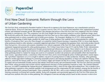 This essay discusses the First New Deal initiated by President Franklin D. Roosevelt during the Great Depression and draws unique parallels to the contemporary urban gardening movement. It highlights how the New Deal’s economic recovery strategies, such as restoring financial confidence, job creation, agricultural reform, and labor improvements, can be compared to the impacts of urban gardening on local communities. The essay explores how both initiatives aim to rebuild trust, create employment, promote sustainable practices, and foster community engagement. Through this comparison, the essay underscores the enduring influence of innovative, community-driven efforts in addressing significant societal challenges.