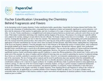 Fischer Esterification: Unraveling the Chemistry Behind Fragrances and Flavors. (2024, Feb 01). Retrieved from https://hub.papersowl.com/examples/fischer-esterification-unraveling-the-chemistry-behind-fragrances-and-flavors/