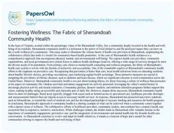 This essay about Shenandoah community health outlines the comprehensive and collaborative approach to wellness in the Shenandoah Valley, Virginia. It highlights the community’s efforts to provide accessible health care, emphasizing preventive measures, education on healthy living, and the integration of physical, mental, and environmental well-being. The essay discusses the challenges faced by rural health care, such as limited access to specialized services and healthcare provider shortages, while also showcasing innovative solutions like telemedicine. Through a focus on fostering a culture of wellness that includes outdoor activities, nutrition education, and community engagement, Shenandoah serves as a model for community-based health promotion. The essay underscores the importance of collective efforts in overcoming obstacles and enhancing the health and well-being of the Shenandoah community. PapersOwl offers a variety of free essay examples on the topic of Community.