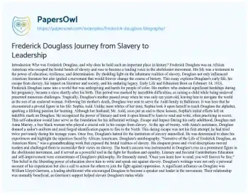 Frederick Douglass Journey from Slavery to Leadership. (2021, Apr 19). Retrieved from https://hub.papersowl.com/examples/frederick-douglass-biography/
