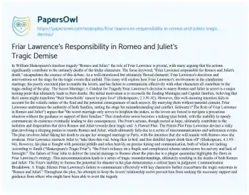 Friar Lawrence's Responsibility in Romeo and Juliet's Tragic Demise. (2025, Mar 27). Retrieved from https://hub.papersowl.com/examples/friar-lawrences-responsibility-in-romeo-and-juliets-tragic-demise/
