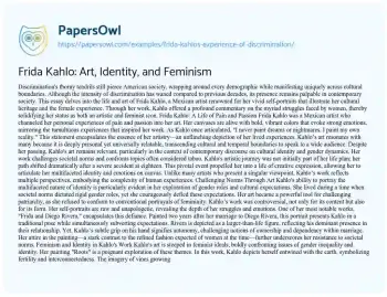 Frida Kahlo: Art, Identity, and Feminism. (2021, Jun 05). Retrieved from https://hub.papersowl.com/examples/frida-kahlos-experience-of-discrimination/