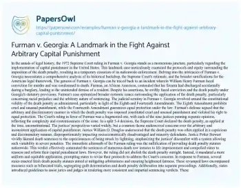 This essay is about the 1972 Supreme Court case Furman v. Georgia, which temporarily halted the death penalty in the United States due to concerns about its arbitrary and discriminatory application. The case involved William Henry Furman, who was sentenced to death under Georgia’s death penalty statutes. The Supreme Court ruled in a 5-4 decision that the death penalty, as applied, violated the Eighth and Fourteenth Amendments. This led to the invalidation of existing death penalty statutes and forced states to reform their laws. The essay also discusses the broader implications of the Furman decision and its legacy in the context of capital punishment in the United States.