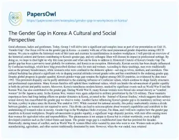The Gender Gap in Korea: A Cultural and Social Perspective. (2021, Mar 14). Retrieved from https://hub.papersowl.com/examples/gender-gap-in-workplaces-in-korea/