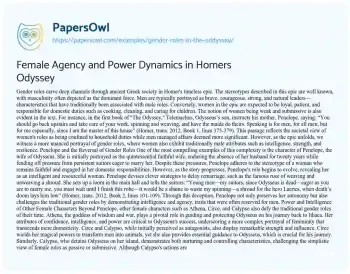 Female Agency and Power Dynamics in Homers Odyssey. (2021, May 27). Retrieved from https://hub.papersowl.com/examples/gender-roles-in-the-oddyssey/