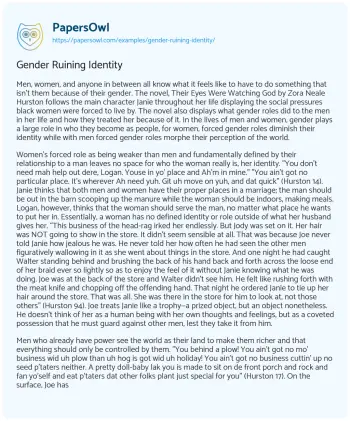 Men, women, and anyone in between all know what it feels like to have to do something that isn’t them because of their gender. The novel, Their Eyes Were Watching God by Zora Neale Hurston follows the main character Janie throughout her life displaying the social pressures black women were forced to live by. The novel also displays what gender roles did to the men in her life and how they treated her because of it. In the lives of men and women, gender plays a large role in who they become as people, for women, forced gender roles diminish their identity while with men forced gender roles morphe their perception of the world.