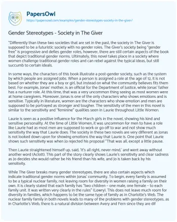 "Differently than these two societies that are set in the past, the society in The Giver is supposed to be a futuristic society with no gender roles. The Giver’s society being “gender free” is progressive and defies gender roles, however, there are still certain aspects of the book that depict traditional gender norms. Ultimately, this novel takes place in a society where women challenge traditional gender roles and can rebel against the typical ideas, but still succumb to certain ideals.