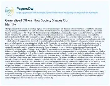 This essay delves into the concept of ‘generalized others,’ an invisible societal rulebook that significantly influences individual behavior and perception. Originating from George Herbert Mead’s sociological theories, ‘generalized others’ represent the collective attitudes and expectations of a community, guiding individuals in understanding social norms and appropriate behaviors. The essay illustrates how, from a young age, individuals absorb cues from their surroundings, shaping their understanding of right and wrong based on society’s collective vibe. This process plays a crucial role in forming moral standards and ensuring social cohesion. However, the essay also acknowledges the downsides of this influence, such as the pressure to conform and the perpetuation of outdated or unjust societal norms. The narrative presents ‘generalized others’ as a balancing act between individuality and conformity, highlighting their role in navigating the complexities of social dynamics. This concept is portrayed as a fundamental aspect of understanding human behavior within a societal context, offering insights into the intricate relationship between the self and the broader community. PapersOwl offers a variety of free essay examples on the topic of Society.