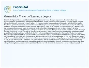 This essay delves into the concept of generativity, a term that transcends the mere act of parenting to encompass a broader impact on future generations. It kicks off by exploring the origins of the term, introduced by Erik Erikson, and expands on its meaning as a crucial stage in adult development. Generativity is portrayed not just as a biological or parental role, but as a broader drive to nurture, teach, and positively impact the world. The essay highlights that generativity isn’t limited to raising children but includes mentoring, community leadership, activism, and creative endeavors. It emphasizes the personal benefits of generativity, such as increased joy, satisfaction, and a sense of purpose. Additionally, the essay discusses the societal importance of generativity in promoting cultural and knowledge continuity. The piece concludes by redefining the concept of legacy, suggesting that generativity is about leaving a lasting, positive mark on the world, contributing to societal progress and the betterment of future generations. This essay presents generativity as an enriching life goal, beneficial for both the individual and society. Moreover, at PapersOwl, there are additional free essay samples connected to Legacy.