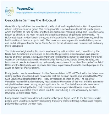Genocide in Germany the Holocaust. (2020, Feb 15). Retrieved from https://hub.papersowl.com/examples/genocide-in-germany-the-holocaust-2/