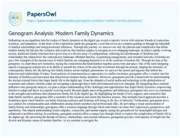This essay about the significance of genogram analysis in understanding the intricate dynamics of modern families. It highlights how genograms serve as a powerful tool for deciphering the intergenerational patterns, diverse configurations, and external influences that shape contemporary family life. By tracing family history, relationships, and strengths, genograms offer valuable insights into the resilience and adaptability of families in the digital age. Additionally, the essay emphasizes the role of genograms in fostering communication, collaboration, and empathy among family members and professionals, ultimately contributing to a deeper understanding and support of families in all their complexity.