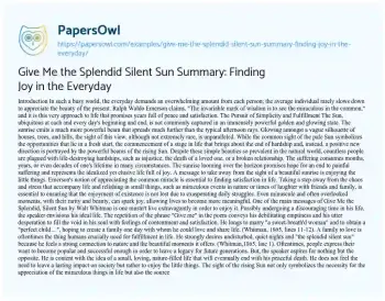 Give Me the Splendid Silent Sun by Walt Whitman is a poem that celebrates the joy and beauty of everyday life. This essay will provide a summary and analysis of the poem, exploring how Whitman uses language and imagery to evoke a sense of wonder and appreciation for the world around us. The piece will examine the themes of nature, human experience, and the contrast between urban and rural life present in the poem. The overview will highlight how Whitman’s poetic style and choice of subject matter work together to create a moving tribute to the simple pleasures and profound beauty of the world, encouraging readers to find joy in their own daily lives. Also at PapersOwl you can find more free essay examples related to Poetry Analysis.