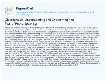 This lively and relatable essay dives into the world of glossophobia, the intense fear of public speaking, with a tone that’s both engaging and reassuring. It begins by painting a vivid picture of the anxiety and physical symptoms associated with this common phobia, emphasizing that it’s more than just ordinary nervousness. The essay then offers practical and approachable strategies for overcoming glossophobia, stressing the importance of starting small and gradually facing larger audiences. It highlights the power of thorough preparation, not just in memorizing speeches but in truly understanding the content. The essay also suggests using mindfulness and relaxation techniques like deep breathing and visualization to manage anxiety. Additionally, it encourages a mindset shift, viewing public speaking as an opportunity rather than a threat. For those needing extra support, it suggests considering professional help like public speaking courses or Cognitive Behavioral Therapy (CBT). Concluding on an empowering note, the essay reminds readers that perfection isn’t the goal in public speaking; instead, authenticity and the ability to recover from mistakes are key. This piece offers a blend of empathy, humor, and practical advice for anyone looking to conquer their fear of public speaking. On PapersOwl, there’s also a selection of free essay templates associated with Public Speaking.
