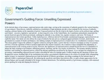 This essay delves into the pivotal role of expressed powers, explicit grants of authority outlined in constitutions or legal documents. Serving as the script for the political stage, these powers define the roles of executive, legislative, and judicial branches, fostering a delicate balance in the separation of powers. Examining examples like the Commerce Clause, the essay illuminates how expressed powers adapt to the evolving needs of society. Beyond constitutional texts, it explores the real-world impact of these powers, influencing policies and decisions, and shaping the essence of modern democracies. Join the exploration to unravel the nuanced dynamics that underpin effective governance. PapersOwl showcases more free essays that are examples of Government.