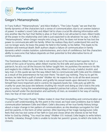 In Franz Kafka’s “Metamorphosis,” and Alice Walker’s, “The Color Purple,” we see that the family dynamics of the characters lack a sense of communication, due to an uneven balance of power. In walker’s novel Celie and Albert fail to share crucial life altering information with one another like the fact that Nettie is alive or that Celie is not attracted to men. Albert holds all the power in the relationship and Celie is just expected to do whatever he says.