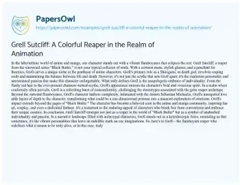 Delve into the anime and manga cosmos with this essay exploring the vivacious character of Grell Sutcliff from “Black Butler.” Not your typical reaper, Grell captivates with a flamboyant flair—crimson hair, stylish glasses, and an unconventional scythe. Unfolding beyond the surface, the essay delves into Grell’s role as a Shinigami and the dynamic personality that sets this character apart. Beyond the theatrics, Grell’s unrequited love for Sebastian Michaelis adds emotional complexity, transforming the character into a nuanced exploration of passion and identity. Discover how Grell’s impact resonates far beyond “Black Butler,” making a lasting mark in the anime and manga community as a symbol of unapologetic individuality. Join the journey into animation’s vibrant realm, celebrating the colorful and unforgettable persona of Grell Sutcliff. PapersOwl offers a variety of free essay examples on the topic of Animation.
