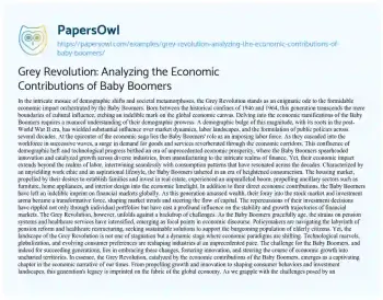 This essay about the Grey Revolution explores the profound economic impact of the Baby Boomers, born between 1946 and 1964. Examining their demographic influence post-World War II, the narrative unfolds with the Baby Boomers’ role as a robust labor force, driving demand and catalyzing innovation across industries. Their imprint extends to consumption patterns, notably in the housing market, while their financial prowess transforms global markets. Despite these contributions, the essay acknowledges challenges as the Baby Boomers age, placing strains on pension and healthcare systems. The evolving economic landscape, marked by technological advancements and changing preferences, presents a dynamic backdrop, urging successive generations to adapt and innovate. In essence, the Grey Revolution is portrayed as a complex and impactful economic phenomenon shaped by the Baby Boomers’ lasting legacy.