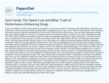 This essay critically examines the phenomenon of “gym candy,” or performance-enhancing drugs (PEDs), in the context of sports and fitness. It explores the allure of these substances, promising rapid muscle growth and improved performance, and contrasts this with the serious health risks and ethical dilemmas they pose. The essay highlights the severe health implications, including hormonal imbalances and psychological effects, that come with the use of steroids and other PEDs. It also delves into the ethical concerns surrounding gym candy, emphasizing how its use undermines fair competition and the integrity of sports. Furthermore, the piece addresses the broader social impact, particularly the influence on young athletes who might be tempted to follow in the footsteps of PED-using sports idols. The essay concludes by advocating for education, strict anti-doping regulations, and the promotion of natural training methods, underscoring the importance of integrity and hard work in achieving athletic excellence without resorting to the dangerous shortcut of gym candy. At PapersOwl, you’ll also come across free essay samples that pertain to Drugs.