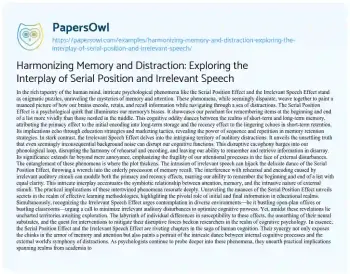 In an essay exploring the Serial Position Effect, one can delve into the intriguing nuances of memory biases. This phenomenon elucidates our tendency to remember items at the beginning and end of a list more effectively than those in the middle. Exploring its intricacies involves unraveling the psychology behind primacy and recency effects, understanding how information gets encoded into long-term and short-term memory, and its practical implications in various domains. From educational techniques that leverage this phenomenon to marketing strategies harnessing the power of sequence, the essay would dissect the role of the Serial Position Effect in shaping memory retention. Moreover, it could delve into research avenues exploring individual differences, neural mechanisms, and interventions aimed at optimizing memory recall amidst this cognitive bias. More free essay examples are accessible at PapersOwl about Memory.