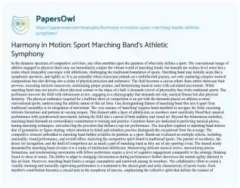 This essay about the intersection of athleticism and artistry in marching bands challenges traditional perceptions of sports. While the conventional image of athletes in physical duels may not immediately align with marching bands, the narrative unfolds to showcase the physicality and precision demanded by this unique art form. The performers traverse the field with instruments, executing choreography that demands both musical finesse and physical dexterity. The integration of movement and the commitment to training elevate marching band to the realm of intellectual athleticism, mirroring the strategic thinking found in traditional sports. The competitive nature, mental acuity, and teamwork inherent in marching bands redefine the boundaries of sports, positioning them as a distinctive and artistic athletic pursuit. PapersOwl offers a variety of free essay examples on the topic of Sports.