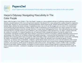 An essay on Harpo from Alice Walker’s “The Color Purple” delves into the intricate portrayal of masculinity, societal pressures, and personal growth within the novel. It explores Harpo’s evolution from adhering to societal norms to confronting these expectations through his relationship with Sofia. The essay delves into the complexities of gender dynamics and power struggles within their marriage, emphasizing Harpo’s transformative journey towards redefining masculinity and embracing mutual respect. It highlights how Harpo’s character serves as a microcosm reflecting broader societal shifts, prompting discussions on gender roles, societal expectations, and the pursuit of authenticity. Ultimately, the essay navigates Harpo’s narrative as a compelling exploration of personal growth and the human quest for identity within the constraints of societal norms. Additionally, PapersOwl presents more free essays samples linked to Masculinity.