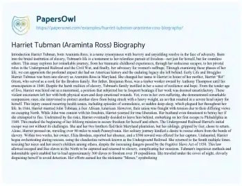 Harriet Tubman (Araminta Ross) Biography. (2021, Apr 24). Retrieved from https://hub.papersowl.com/examples/harriet-tubman-araminta-ross-biography/