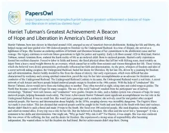 Harriet Tubman’s Greatest Achievement: A Beacon of Hope and Liberation in America's Darkest Hour. (2023, Sep 18). Retrieved from https://hub.papersowl.com/examples/harriet-tubmans-greatest-achievement-a-beacon-of-hope-and-liberation-in-americas-darkest-hour/