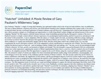 This essay about transforming Gary Paulsen’s novel “Hatchet” into a movie discusses the intricate process of adapting the story for the screen while maintaining its introspective essence. It highlights the challenges of visually narrating the survival tale of Brian Robeson, a thirteen-year-old boy stranded in the Canadian wilderness. The essay emphasizes the importance of casting for Brian’s character, who must convey both the physical and psychological aspects of survival. It also explores how film can enhance the novel’s themes through visual and auditory elements, such as cinematography and sound design, to immerse viewers in Brian’s ordeal. Furthermore, it considers the necessity of innovative narrative techniques to preserve the novel’s introspective quality in the film adaptation. Overall, the essay argues for a balance between visual storytelling and the novel’s intimate exploration of resilience and self-discovery. Also at PapersOwl you can find more free essay examples related to Movie Review.
