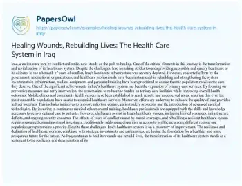 Healing Wounds, Rebuilding Lives: The Health Care System in Iraq. (2024, Mar 18). Retrieved from https://hub.papersowl.com/examples/healing-wounds-rebuilding-lives-the-health-care-system-in-iraq/